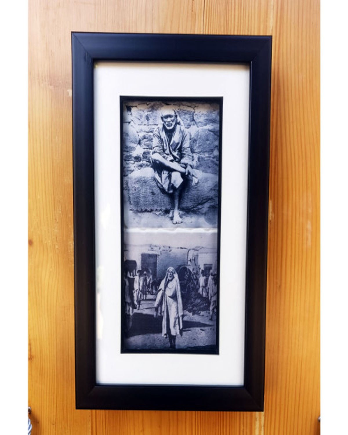 A unique Framed 2-in-one block of four beautiful black and white supposedly original images of Shri Sai showcased for the ardent Sai devotee on a sleek ceramic base with cork matt base finish. The four images namely, one of Shri He rests on the crossed foot. He is wearing a torn kafni (which became synonymous with Shri Sai’s image subsequently). He sports a knotted kind of headscarf which is traditionally over his left shoulder. He sits relaxed yet alert, leaning forward slightly. His expression is intense, all-knowing and compassionate.the Dhuni lit by Him in Dwarkamai. Supposedly an original photograph, it is one of the earliest photos of Shri Sai where He is seen as a young  This picture was taken by a photographer names Shri Kanth Gode from Pune in 1903. The Third image of Shri Sai wearing His usual Kafni standing in an open common area with a tumrel in his hand supposedly on His way to seeking alms or bhiksha is a rare capture and is a constant reminder of the immense respect He gave to His duty and Dharma of a Fakir to seek alms to subsist. The fourth image is another one of the famous pose of Shri Sai leaning against the outer wall of a house, looking at the camera. This is of a time when He seems frail and elderly. The devotees seem to be giving Him support by holding onto each of His arms with love and care. Supporting Shri Sai Baba's right arm is Nana Saheb Nimonkar. Gopalrao Mukundrao Butti is standing on the left side of Shri Sai. Bhagoji Shinde is holding the umbrella above Baba’s head and standing behind while Nana Chopadhar leads from the front. Rare pictures and a rare collection to have them all together, with a beautiful plastic easel stand. Yours to keep or gift!