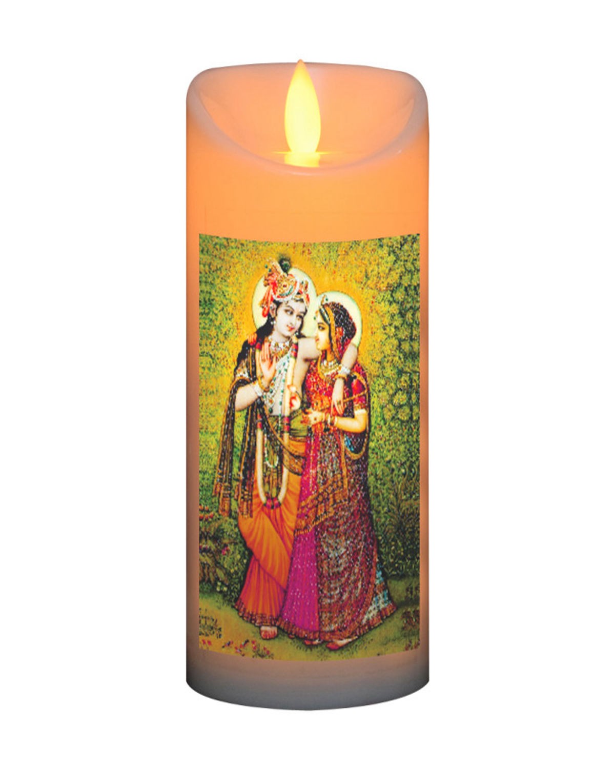 Like a real candle, but easier to manage, these battery-operated candles are safe options for those with small children or elderly people in the house as no open flame means peace of mind knowing that there is no burning candle in one’s home. With their creamy, off-white wax-like exteriors, life-like natural faux flicker, this small, beautiful, endearing LED candle imitates the warm ambiance of real candles without the worry of messy drippings or open flame. Enjoy the illumination of The Shri Radha Krishna’s images and have His benevolence showered.