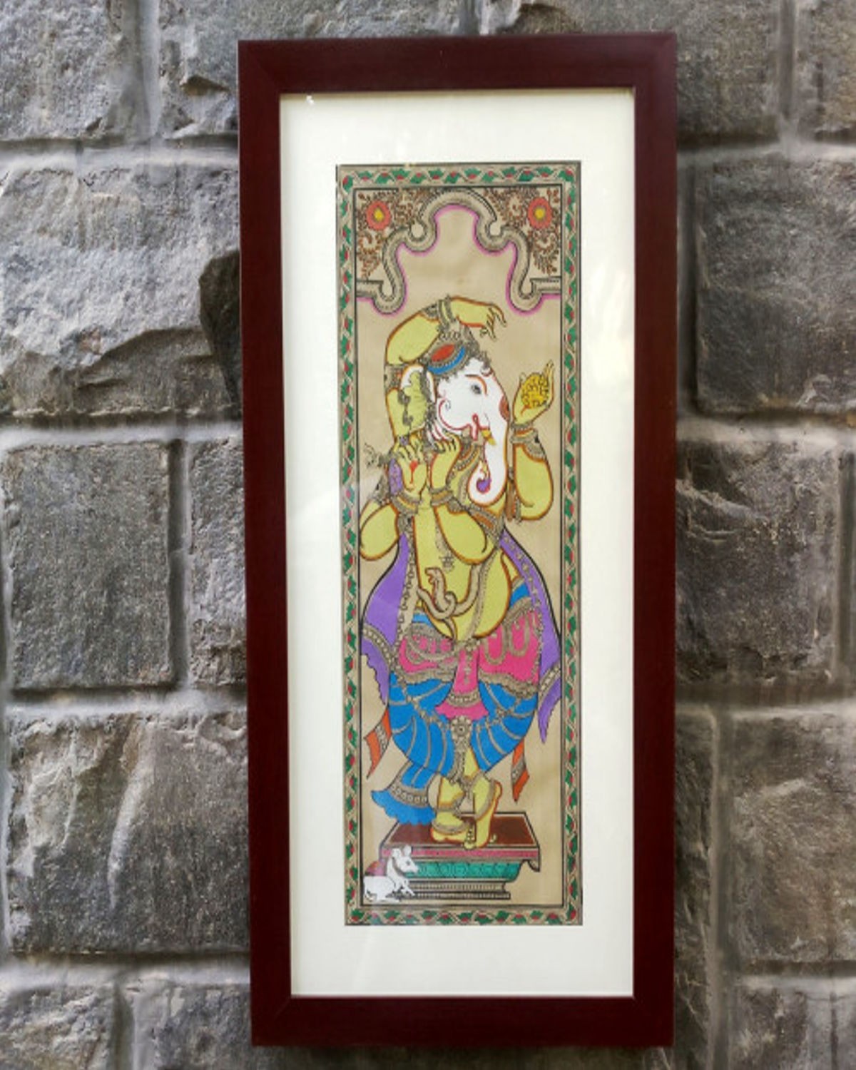 Shri Ganesh Pattachitra made on Tussar silk cloth. This is an exotic ancient painting on Tussar (silk) which is a natural fabric or on hand made canvas (Patta). Soaked in culture, with natural , superb craftsmanship, simplicity in design this painting will add sophistication to your living space.